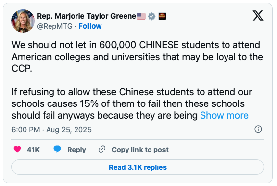“We should not let in 600,000 CHINESE students to attend American colleges and universities that may be loyal to the CCP,” Greene wrote on X. “Why are we allowing 600,000 students from China to replace our American student’s opportunities?”