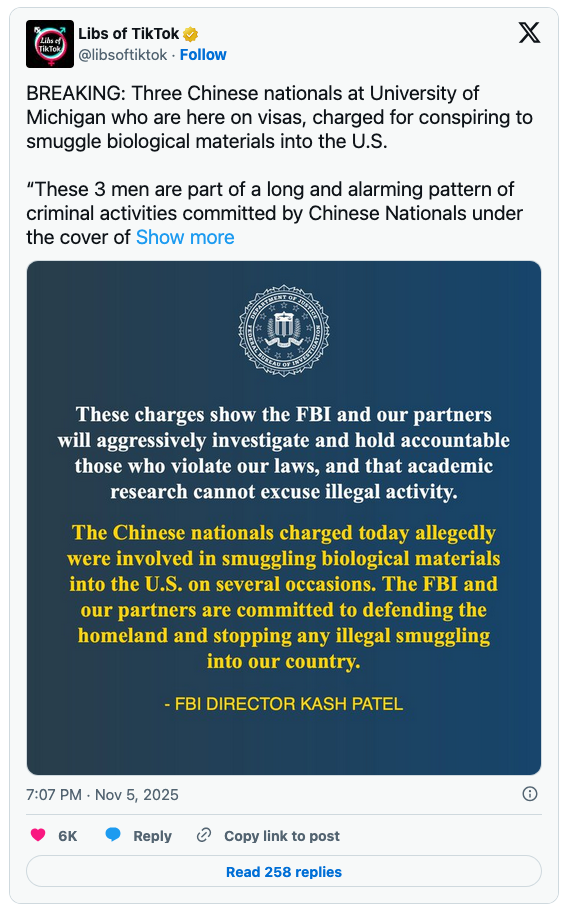 According to the criminal complaint, in 2024 and 2025, Bai and F. Zhang were the recipients of multiple shipments containing concealed biological materials related to round worms which had been sent from the PRC to the United States by Chengxuan Han, a citizen of the PRC [People’s Republic of China]. Han was pursuing a Ph.D. from the College of Life Science and Technology in the Huazhong University of Science and Technology (HUST) in Wuhan, PRC and in June 2025, traveled to the United States to work in the laboratory at UM. Han recently pleaded no contest to three counts of smuggling and one count of false statements, was sentenced and then removed from the United States.